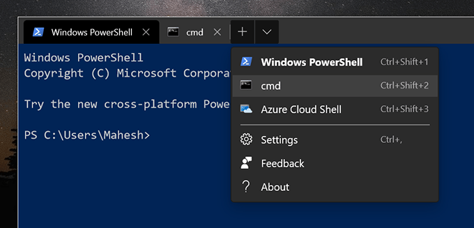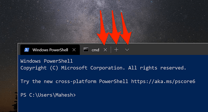- Launch the app and you’ll immediately notice a few new icons right next to the app name at the top. The X icon lets you close the current tab that’s open on your screen. The + (plus) icon lets you open a new tab in the same window in the utility. The down-arrow icon lets you choose the utility you want to open a new tab for (PowerShell or CMD).