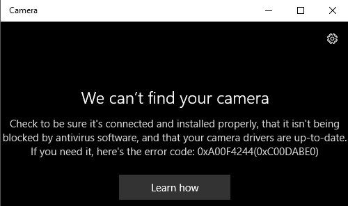 Before we get to that, lets go through the basics. Firstly, open the app and if you don’t already have a webcam built-in or connected to the PC, you’ll see a simple black screen that says We can’t find your camera.