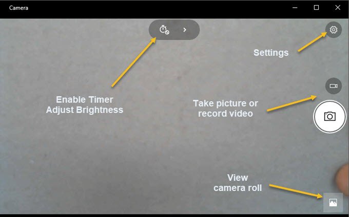 One of the problems with the new slick interface in Windows 10 apps is that sometimes it’s too simplistic and clean. Literally, they have removed buttons and other visual elements that you otherwise expect. For example, there are literally three other buttons in addition to the picture and video buttons.