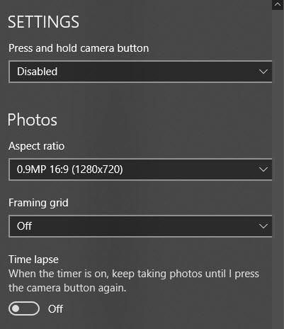 Next, based on your camera, you can pick the resolution that should be captured. Next, you can add a framing grid as an overlay on the camera. The choices are Rule of thirds,** Golden ratio**, Crosshairs and Square. This is useful if you are using the camera app on the tablet device like the Surface Pro.