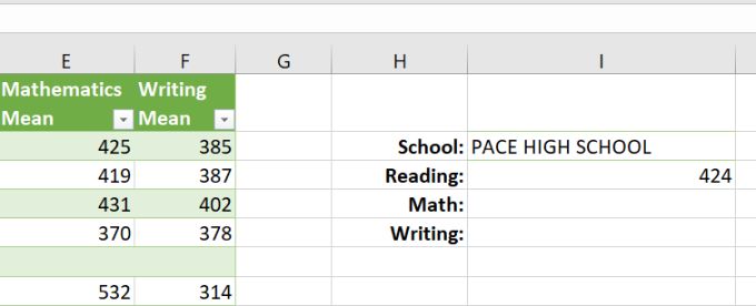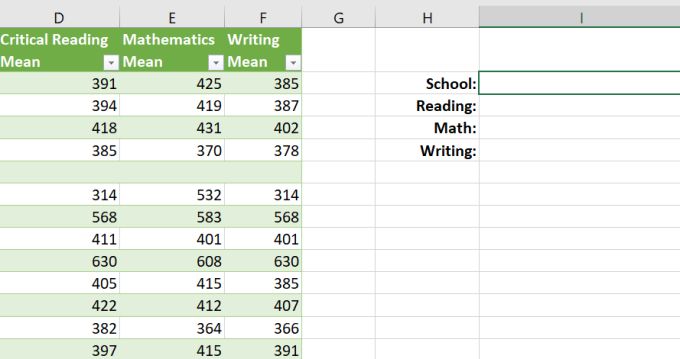 Instead, you can create a simple form in the blank cells on the side of the table. To conduct this search, just make one field for School, and three additional fields for reading, math, and writing scores.