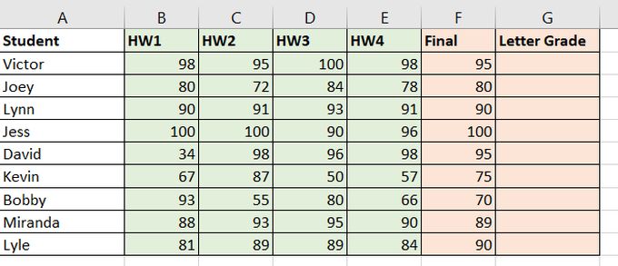 Note that the VLOOKUP function in Excel searches from the bottom end of the grade range with the assigned letter score to the top of the range of the next letter score.