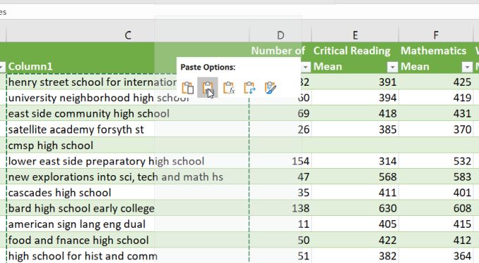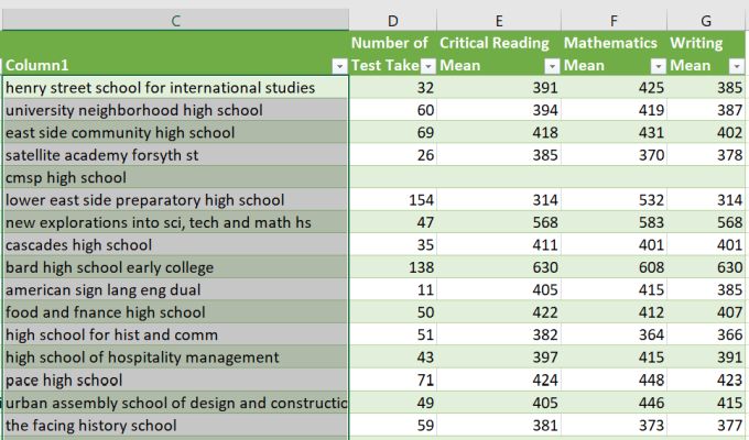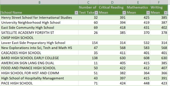 For the following example, we’ll use a large spreadsheet of SAT scores for schools in the United States. This spreadsheet contains over 450 schools along with individual SAT scores for reading, math, and writing. Feel free to download to follow along. There is an external connection that pulls the data, so you’ll get a warning when opening the file, but it’s safe.