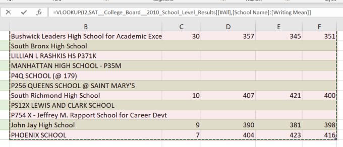 Note: The VLOOKUP function in Excel can only search through cells to the right of the search column. In this example, the school name column needs to be to the left of the data you’re looking up.