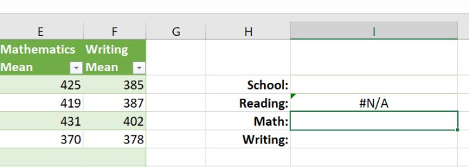 This is because the School field is blank and there is nothing for the VLOOKUP function to find. However, if you enter the name of any high school you want to look up, you’ll see the correct results from that row for the Reading score.