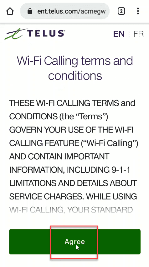 - The provider presents the Terms and Conditions for using WiFi calling. Click Agree to continue.