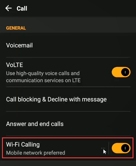 - Click on the button to turn on WiFi calling. It’s a bit hard to see, but there are three dots next to the button. Click on those to continue setting up WiFi calling.