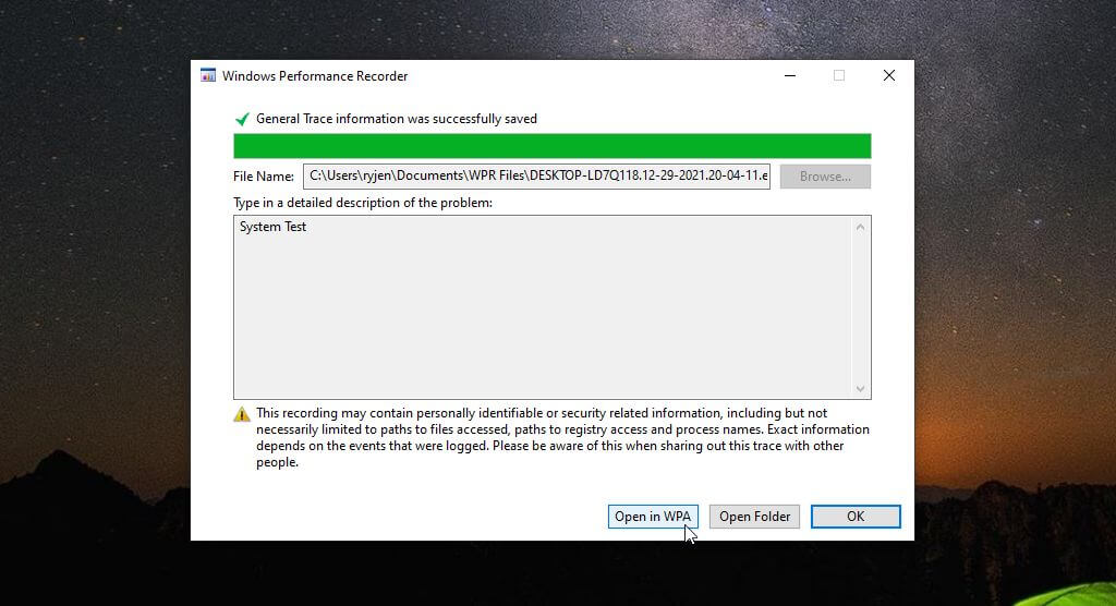 The app will write all data to the ETL file, and you’ll see options at the bottom of the window to open the WPA tool directly or navigate to the ETL file by opening the folder.