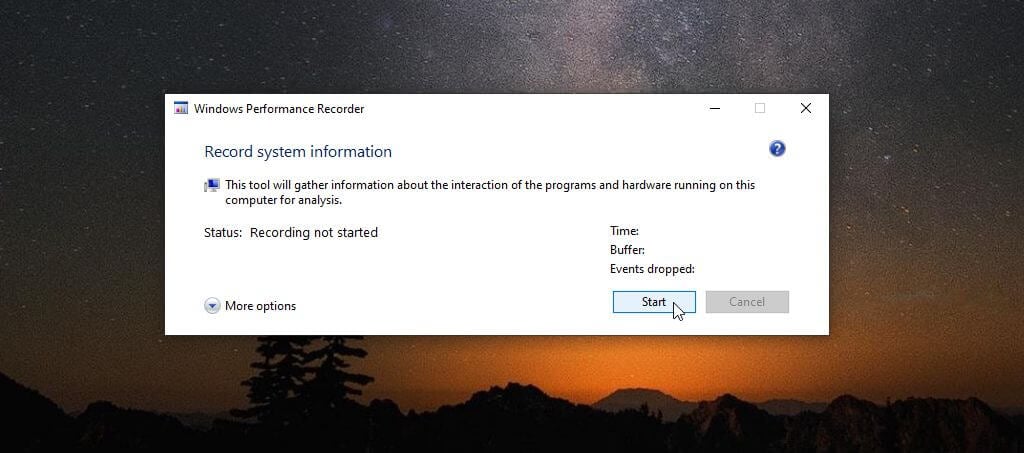 The WPR tool is a straightforward tool to capture events occurring on your system during a specific timeframe. To start the recording, just select the Start button.