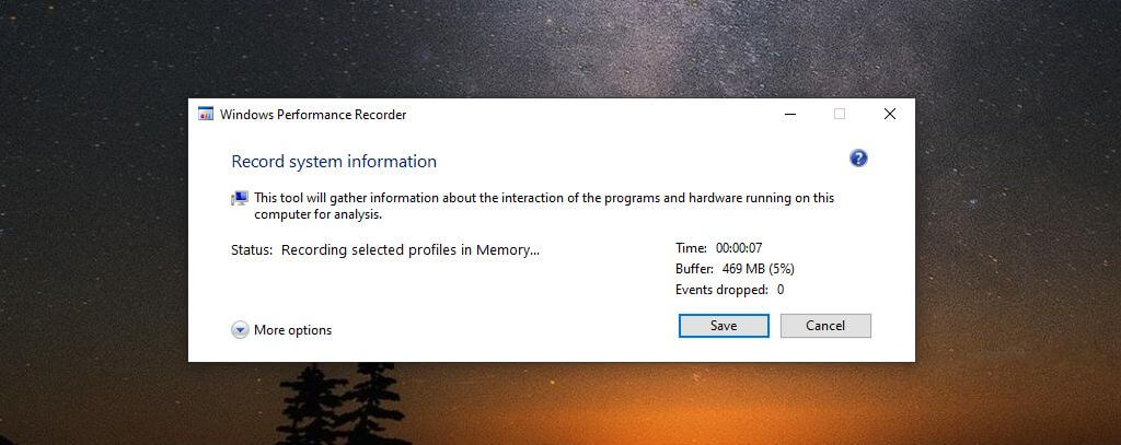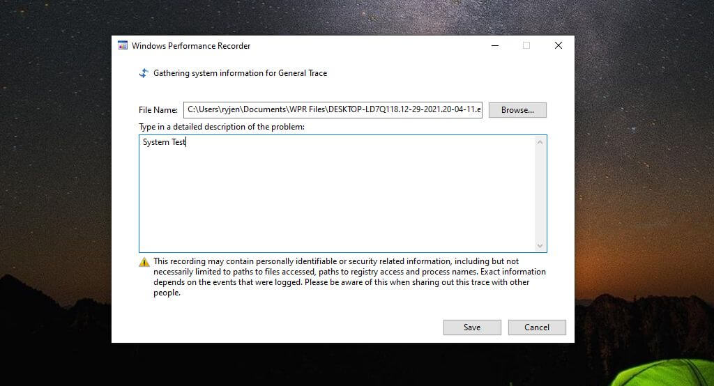 This will launch the system event recording process. Perform actions (like launching and running a program) that you want to use to test your system’s performance.