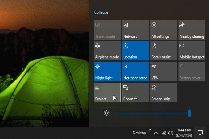 Using this technology is easy. On your Windows 10 PC, just select the Action Center (notification icon) at the right side of the taskbar. Select Project in the pop-up menu.