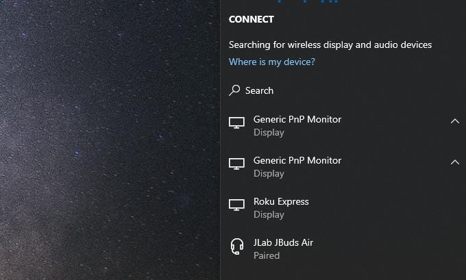 In the next window, select Connect to wireless display. Next, you’ll see a list of devices that are available wirelessly. You’ll see any of your Smart TVs show up in this list.