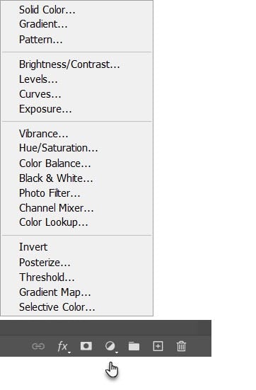 Without clicking anywhere, go to the Layers panel and select Create****new fill or adjustment Layer.