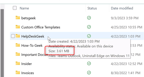 - Locate the folder whose size you want to check. To quickly check the size of the folder, hover your mouse over it. You’ll see the size of the folder in the pop-up.