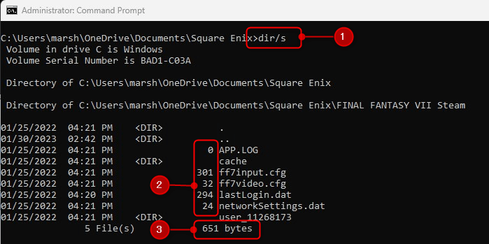 - Once in the correct directory, run the dir/s command. This gets the individual file sizes of each file in the folder and also gives you a sum of all files.