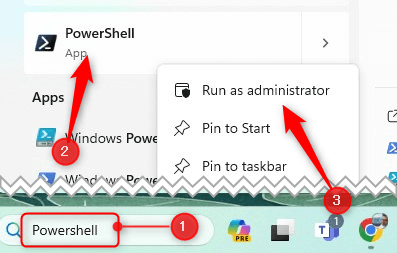 - Open Windows PowerShell as an Admin. To do so, search PowerShell in Windows Search, right-click PowerShell in the results, and then click Run as administrator in the context menu.