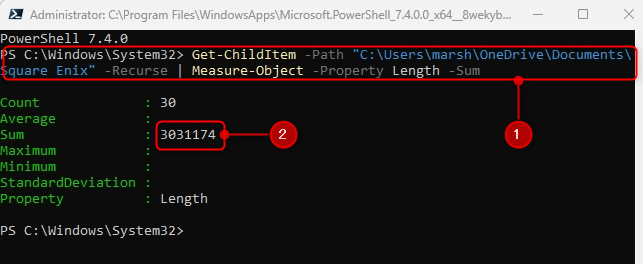 - There’s no need to change directories here. Enter this command: Get-ChildItem -Path “C:folder-path” -Recurse | Measure-Object -Property Length -Sum Replace “C:’folder-path” with your actual path. You’ll see the folder size in the result, which is the sum of all the files in that path.