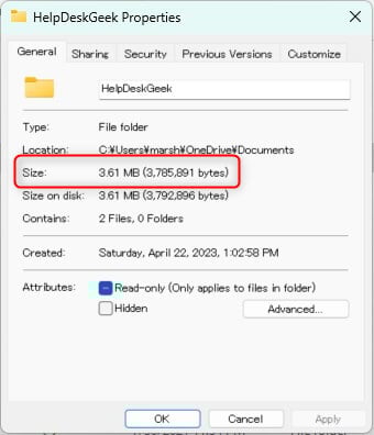 - The Properties window of the selected folder will appear. In the General tab, you can see the size of the folder, as well as additional information such as how many files and folders are contained within it.