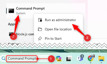 - Open Command Prompt as an Admin. To do so, search Command Prompt in Windows Search, right-click Command Prompt in the results, and then click Run as administrator in the context menu.