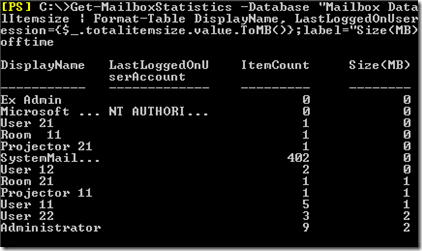 If the above command does not work for some reason, you can also try this one: Get-MailboxStatistics -Database “Mailbox Database” | Sort -Property TotalItemsize | Format-Table DisplayName, LastLoggedOnUserAccount, ItemCount, @{expression={$_.totalitemsize.value.ToMB()};label=“Size(MB)”}, LastLogonTime, LastLogoffTime