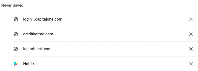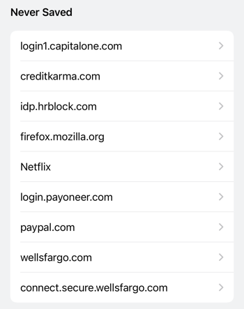 If you believe that you’ve saved a password but don’t see it in the list, scroll to the bottom. You’ll see a Never Saved section that might contain what you’re looking for.