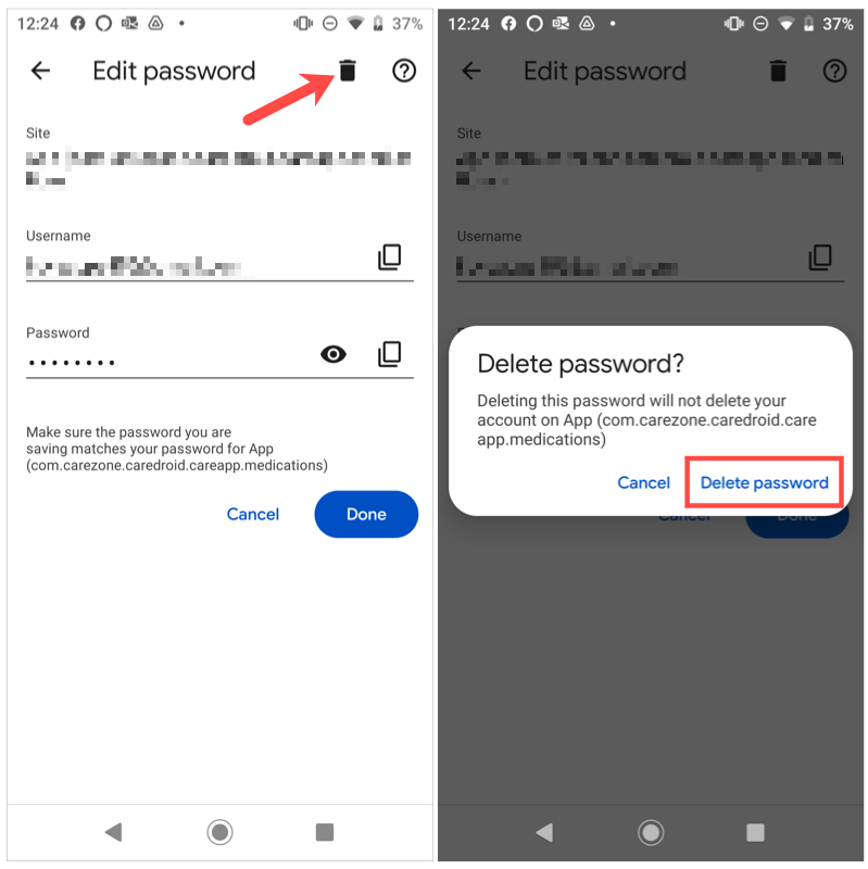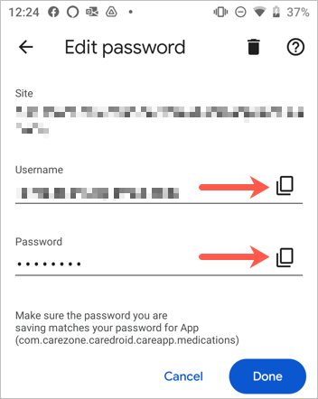 On Android, choose a login, make your edits, and tap Done to save the changes. To remove a password, tap the trash can icon at the top and confirm in the pop-up.