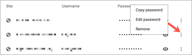 Select the three dots to the right of a password for additional actions, including copy, edit, and remove.