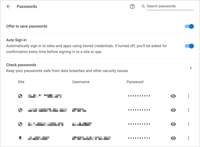 You’ll see a list of your saved passwords in alphabetical order with the site, username, and password masked by dots. To locate a particular password, use the Search Passwords field at the top.
