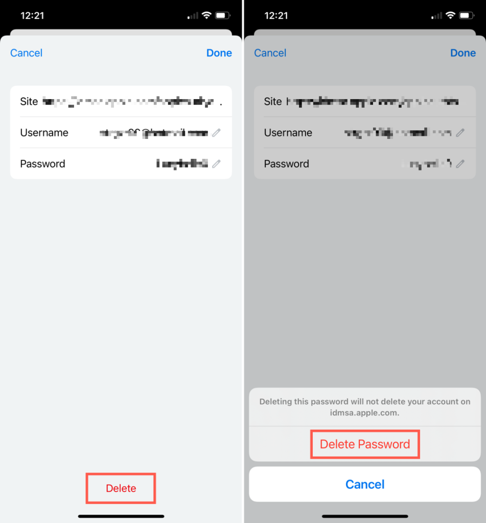On iPhone, choose a login, tap Edit at the top to make changes, and Done when you finish. To remove one, tap Edit> Delete and confirm in the pop-up.
