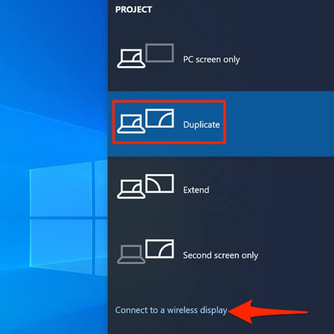 - In the Project menu, choose **Duplicate**. This will duplicate the contents of your PC’s screen on your Roku screen. * Select **Connect to a wireless display** at the bottom.