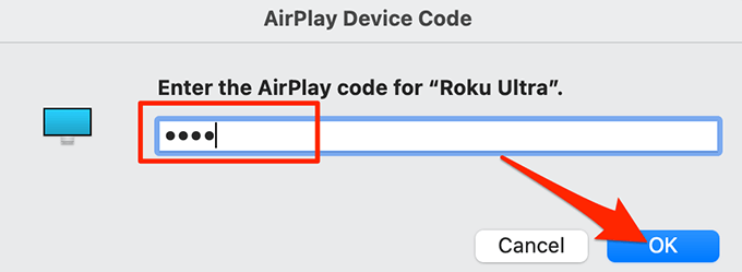 - You’ll see a code on your Roku’s screen. Enter this code in the prompt on your Mac, and then select **OK**.