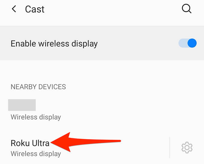 - From the top, turn on the **Enable wireless display** toggle. * Select your Roku device from the list.