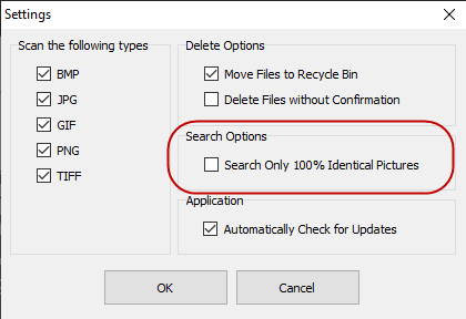 In the Settings, you can specify that it only gives you results which are “100% identical”. This is useful but also rather inflexible. I would much rather prefer say “anything of 90% and over identical”. Or thereabouts.