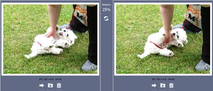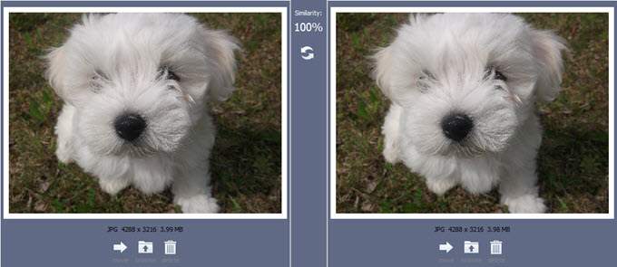 It will put two photos side-by-side and in the middle, it will give you a “similarity” rating. The higher the rating, the more the images look the same (according to Photo Finder).