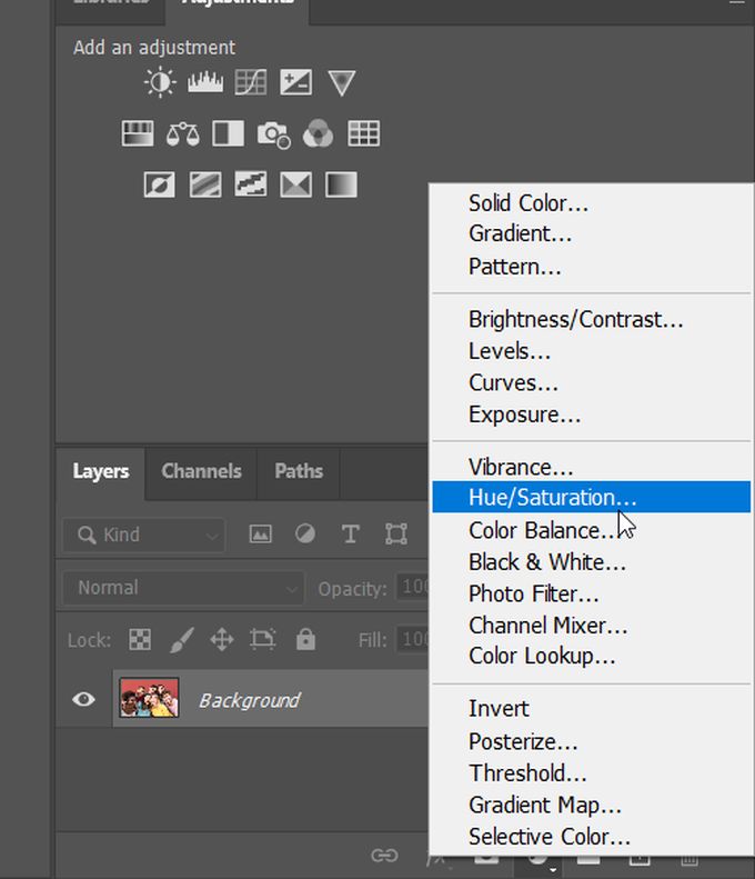 - At the bottom of the layer panel, find the circle icon that appears half light and half dark. This is the Create a new fill or adjustment option. Select the Hue & Saturation adjustment. You’ll see a new adjustment layer appear in the layer panel.