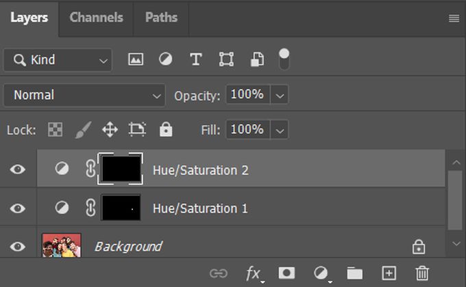 - Once the selection has been made, you can go to the **Create a new fill or adjustment** icon like before, and select **Hue & Saturation**. Then, you can whiten this person’s teeth the same way as earlier.You can add as many adjustment layers as you wish if you need to whiten the teeth of multiple people.