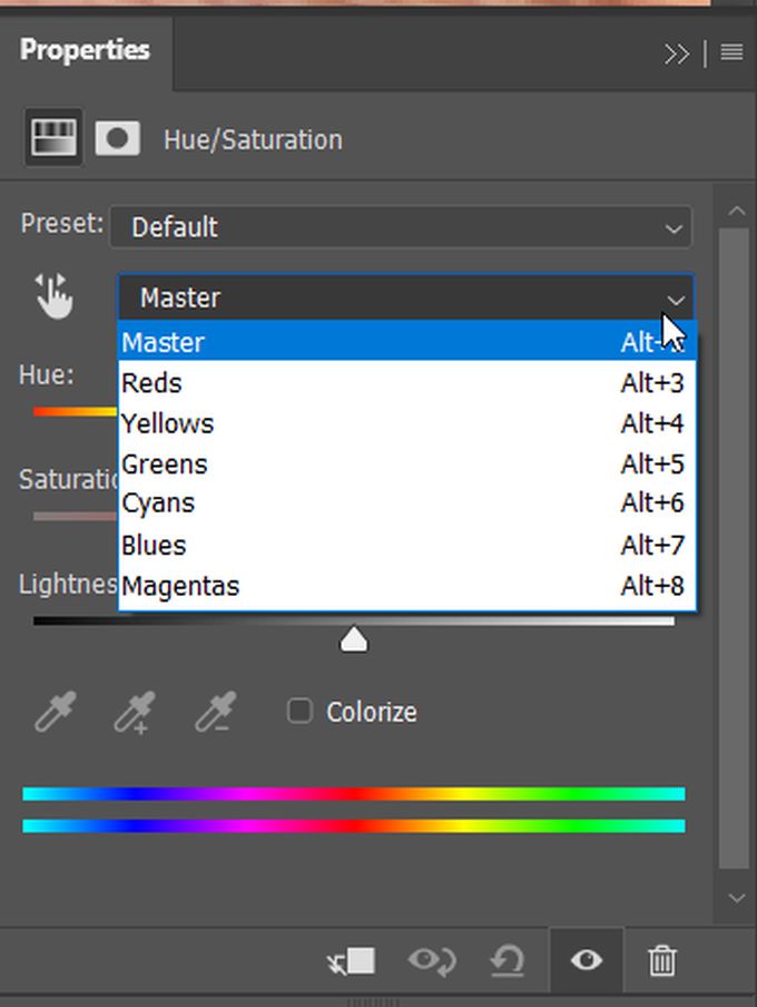 - In the Hue & Saturation properties panel, find the dropdown that is selected as **Master**. This dropdown chooses what color channel in your selection you’ll be manipulating. In this case, you’ll want to choose the **Yellow** channel. Next you’ll want to look at the **Saturation** slider, and turn it down until there isn’t as much yellow visible.