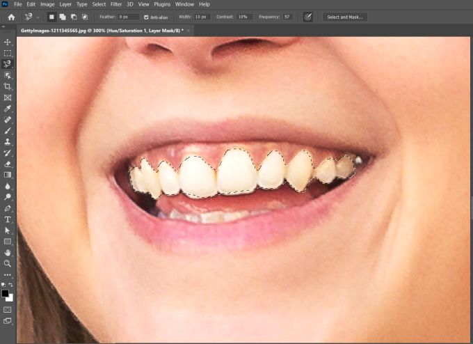 - Open your image in Photoshop and zoom in on the teeth you want to whiten. Then, select the Lasso tool from the tool bar. Using this, you’ll want to make a selection around only the teeth of your subject, like so: