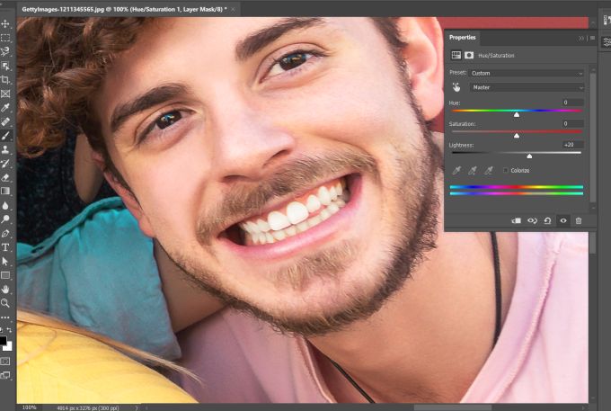 - You’ll also probably want to brighten the whitened teeth at this point, as this can help the smile in your photograph stand out even more. Change the color channel dropdown back to **Master**. Then, use the **Lightness** slider and turn it up in order to make the teeth appear more bright.