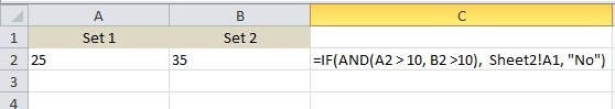 Here we are saying that if the value of A2 is greater than 10, then multiple B2 by 10, otherwise multiple B2 by 5 and output that value into cell C2. Now let’s make it more complicated. What if we wanted to output Yes if both A2 and B2 are greater than 10?