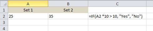 We have a very simple example here. Two columns with two numbers, 25 and 35. If Column C, we want to check if Column A is greater than 10, we will output the text Yes, otherwise the text No. A few things to note: