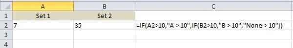 Here, I am saying that if A2 is greater than 10, output a value, but if not, then perform another IF comparison. IF B2 is greater than 10, then output a different value. You can nest IF statements 64 levels deep, which means you can do some pretty complicated stuff. You’ll probably never need to go that far, but sometimes it’s useful a few levels deep.