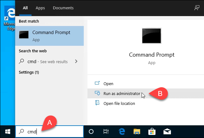 - Type cmd in the search bar and the top result should be Command Prompt. Click on Run as administrator.