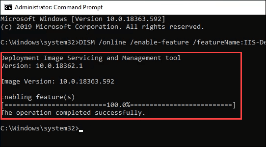 - You’ll see a progress bar appear. Once it reaches 100.0% and you see the message, “The operation completed successfully.” you can close the Command Prompt. IIS is installed.