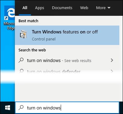 - Start typing “turn on windows” in the Search bar. The Turn Windows features on or off utility will show as a result. Click on it.