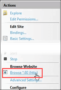 - On the right side of the IIS Manager look under the **Browse Website **section. Click on **Browse *:80 (http). **That will open the default web site in your default web browser.