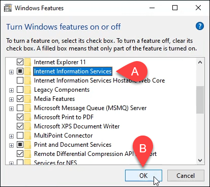 - The **Windows Features **window will open. It may take a bit for the different features to load. Once it does, click on the checkbox next to **Internet Information Services** and then click the **OK** button.
