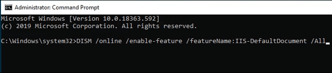- Type in the command **DISM /online /enable-feature /featureName:IIS-DefaultDocument /All **and press **Enter**.