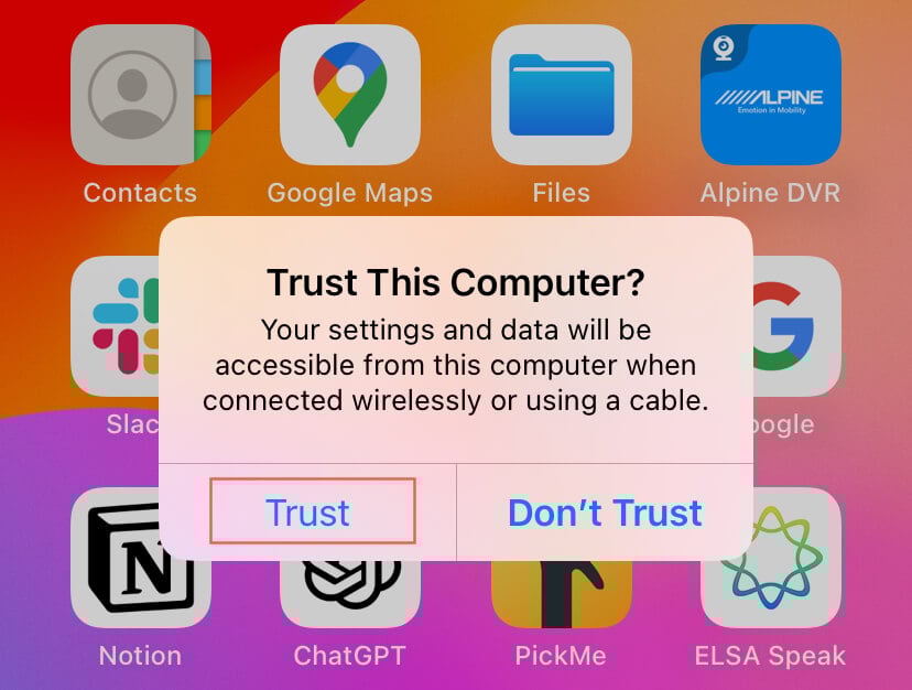 - Wait for a prompt that says “Trust This Computer?” and tap Trust.