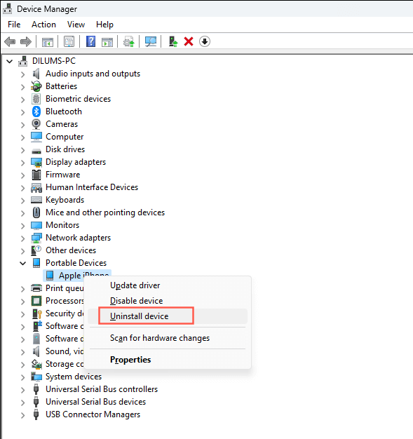 - Expand the Portable Devices category, right-click Apple iPhone, and select Uninstall device.